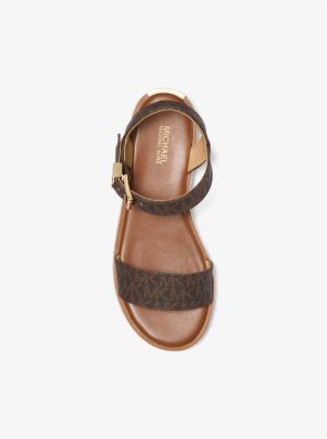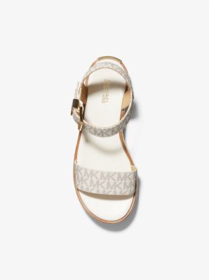 Strut into summer with the perfect shoe for every occasion. Finished with our “MK” initial hardware, the Richie sandal is crafted from Signature logo-print canvas and set on a woven jute platform for a bohemian twist. We love how the ankle strap and chunky sole combine to create the illusion of longer legs.